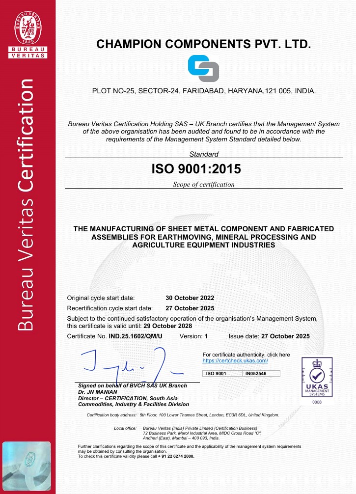 Champion Components is an ISO 9001:2015 certified company.